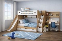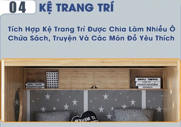 - Kệ sách/Đầu giường: Tích hợp nhỏ gọn ở mỗi tầng để điện thoại, kính mắt hoặc đèn đọc sách.