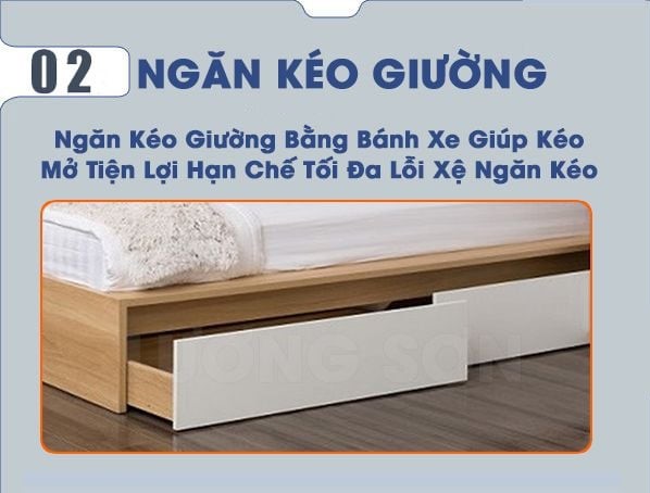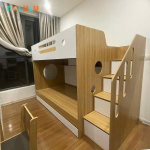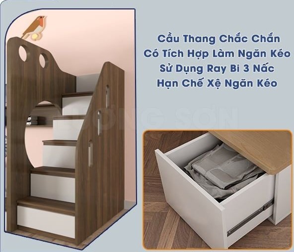 - Hệ thống ngăn kéo gầm: Tận dụng khoảng trống dưới tầng 1 để đựng chăn màn, quần áo.